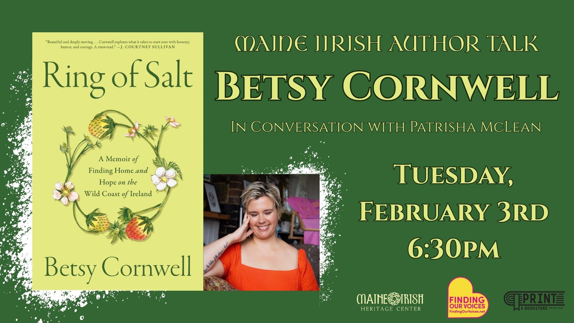 In conversation with Patrisha McLean Tuesday, February 3rd, 2026 6:30pm Doors open at 6:00pm Join us for another Brigid’s Day program: a Maine Irish Author Talk with Betsy Cornwell! Focusing on her new memoir, “Ring of Salt,” Betsy will be in conversation with Patrisha McLean, founder of Finding our Voices. We will have books […]
